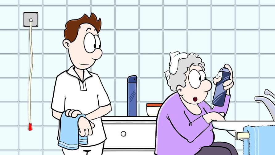 Hier noch einige Informationen zum visuellen Stil des Films: Es handelt sich um einen Animationsfilm in einem klaren, reduzierten Comic-Stil mit bunten, kontrastreichen Farben. Die gezeigten Figuren haben große Augen und wirken freundlich und sympathisch. Frau Großmann hat lockiges, graues Haar. Pfleger Paul trägt kurzes, braunes Haar mit einer kleinen Tolle. Hintergrundelemente verdeutlichen die jeweilige Umgebung der Szene, z. B. Kachelwand und Waschbecken im Bad und Aktenschrank im Konferenzraum. Zwischen den Szenen werden Texttafeln mit weißer Schrift auf schwarzem Hintergrund eingeblendet.
